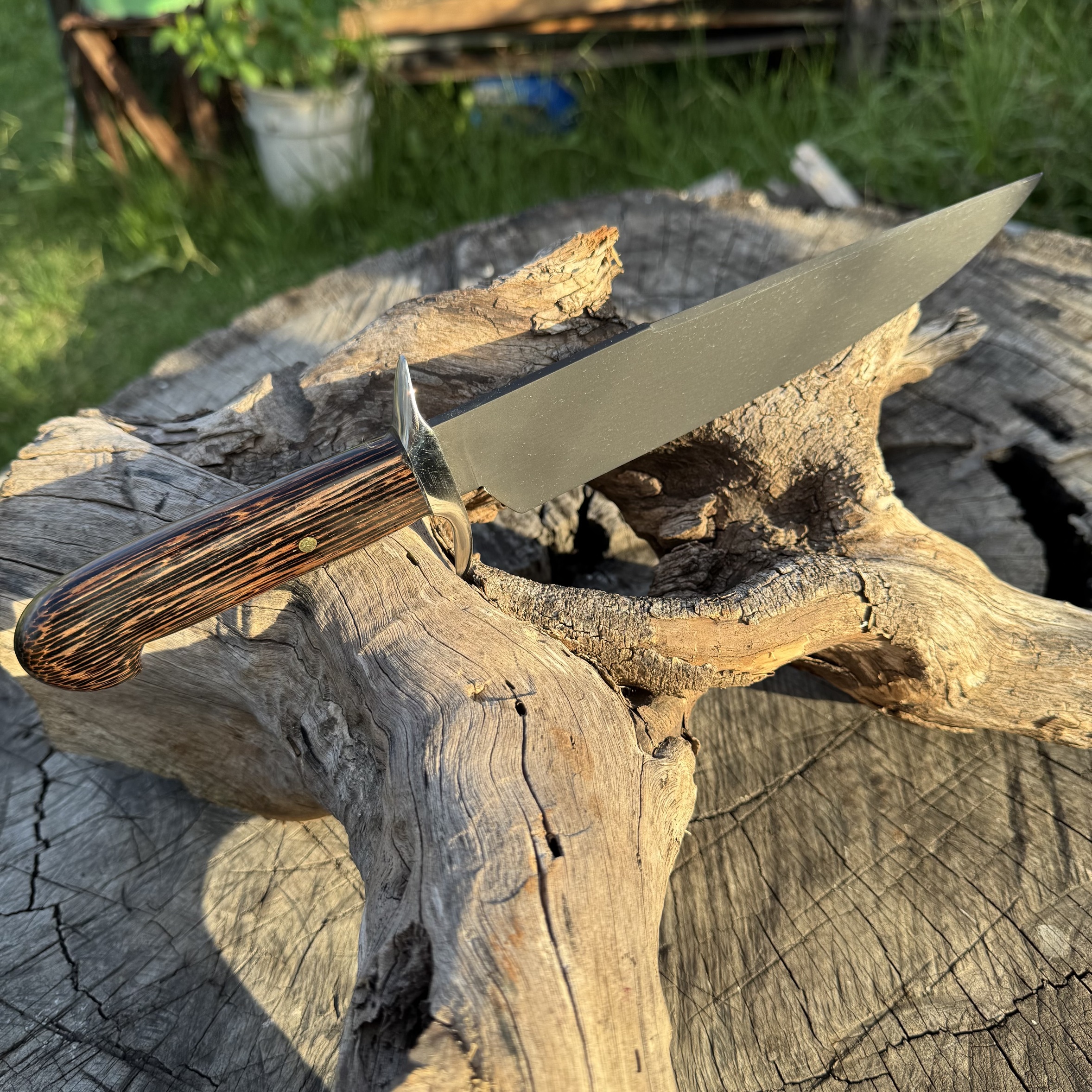 Descripción: Cuchillo forjado en acero 1045 , templado en agua, muy tenaz y con buena retención de filo. Fosfatizado. Guarda en acero inoxidable y cabo en madera de Palma.