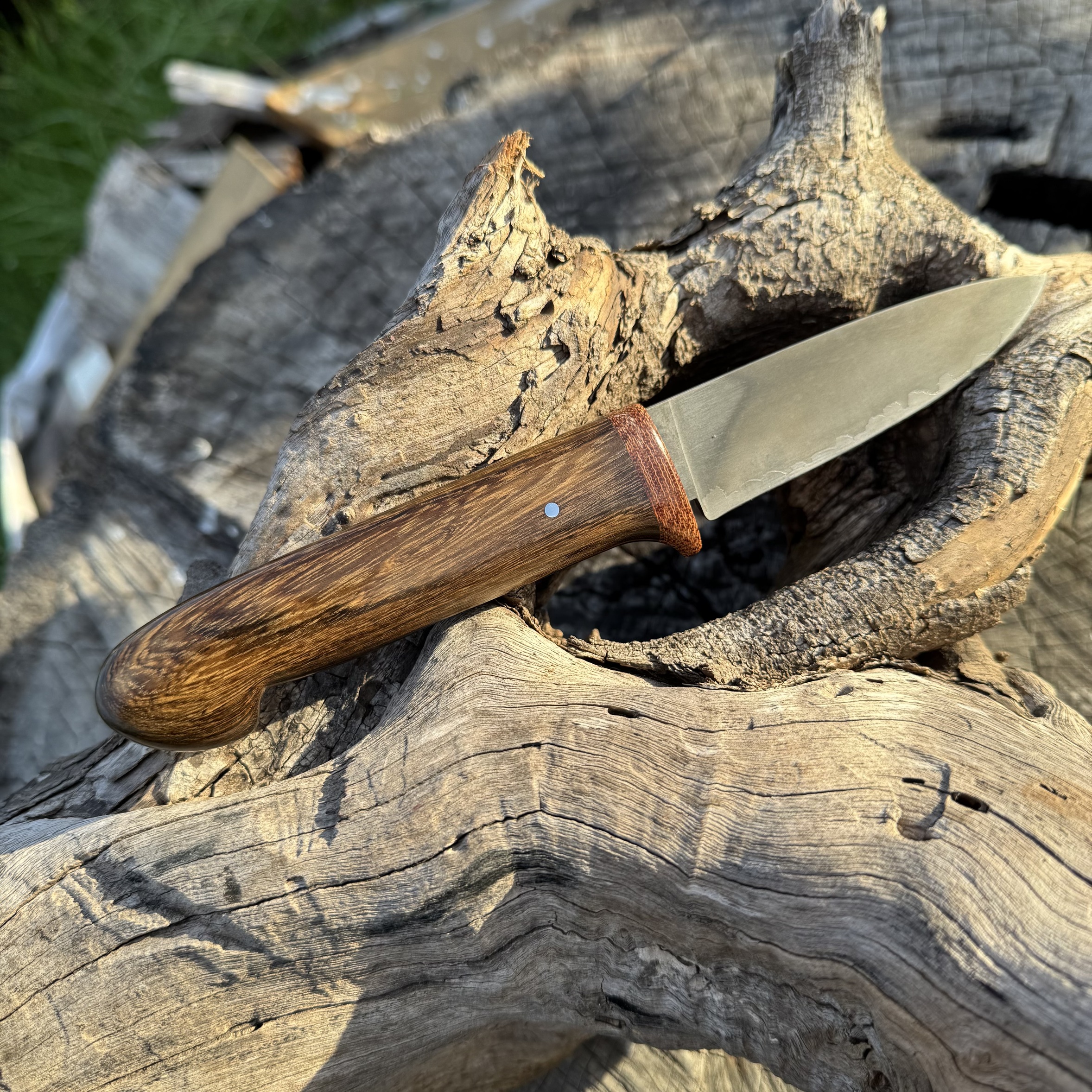 Descripción: Acero XC70 con temple diferencial y revelado sectorizado. Cabo ergonomico realizado en madera de Guayubira y Guarda en micarta de tela funda artesanal en cuero vacuna