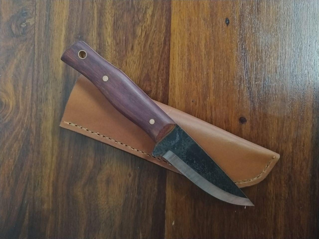Scandi pavonado de Javier Hernansáiz en acero N690Co forjado y mango de cocobolo. Un utilitario de medidas contenidas, muy cómodo para campo.