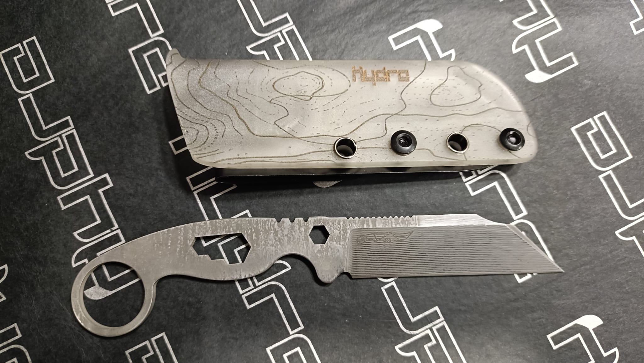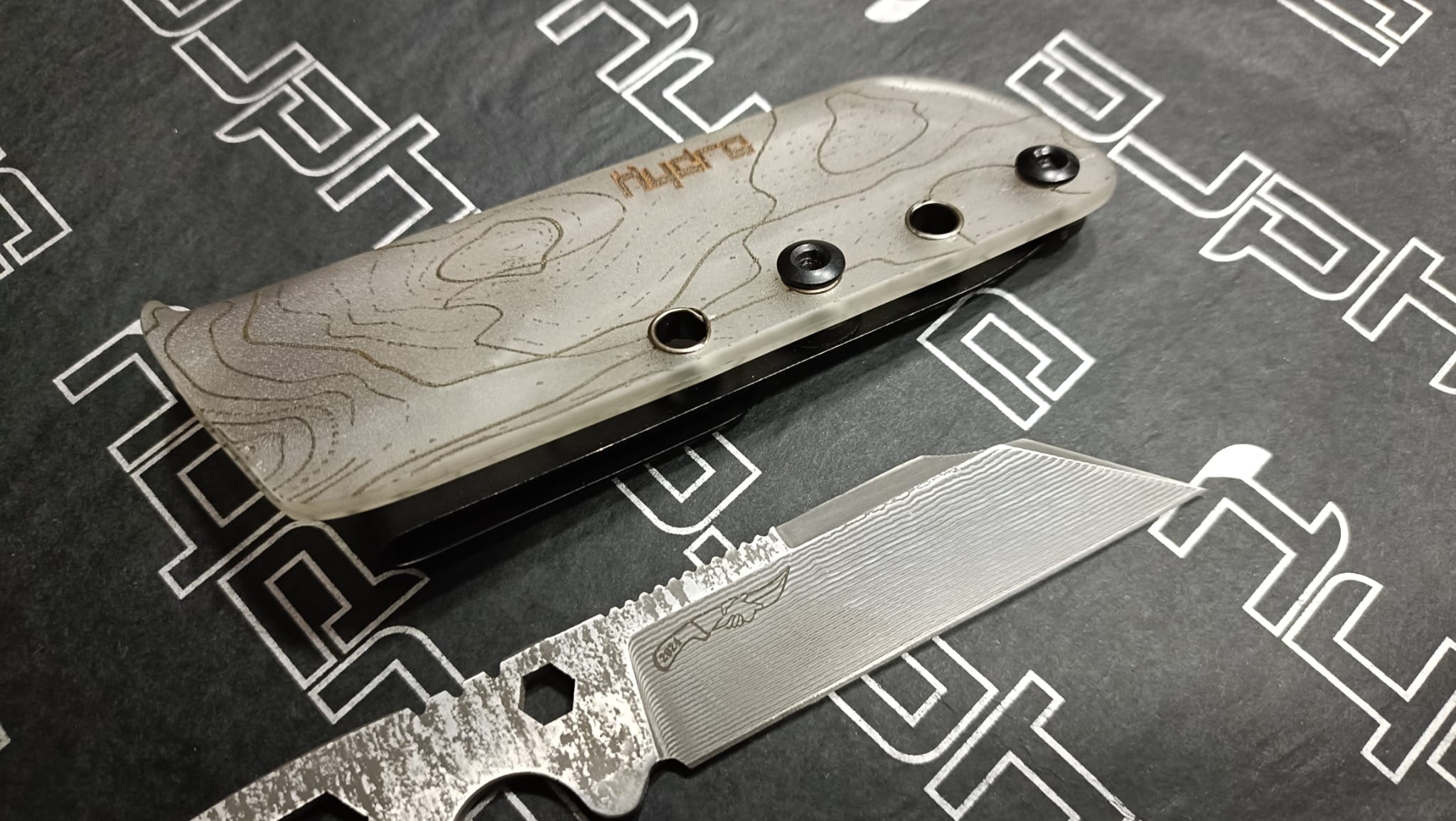 Descripción: Buzzard edición especial para esta subasta solidaria en acero Balbach Damast (damasco alemán) con funda extra del Sastre del Kydex (Fundas RK) con patrón de mapa topográfico grabado a láser, tanto en el kydex como en el propio clip.