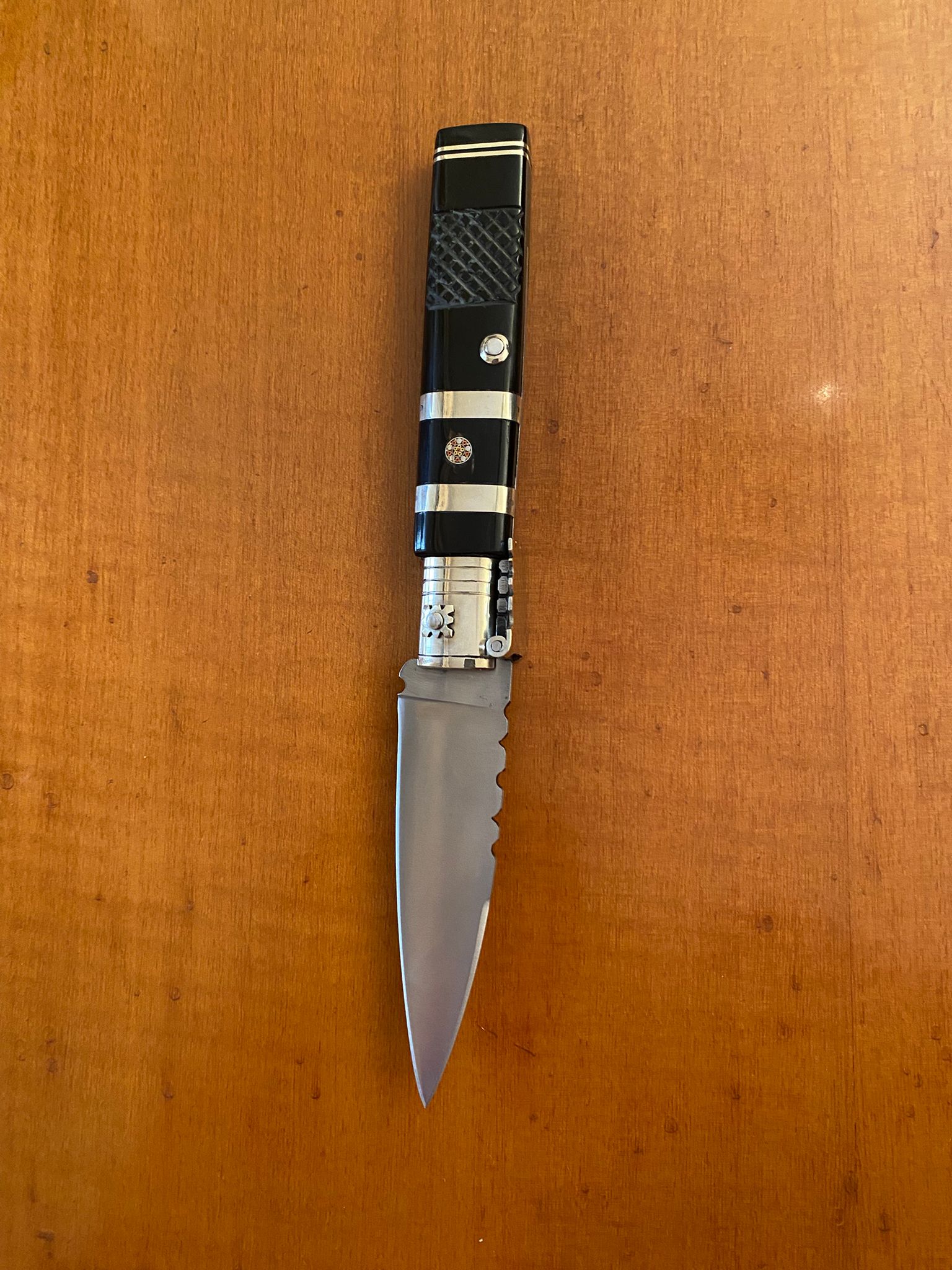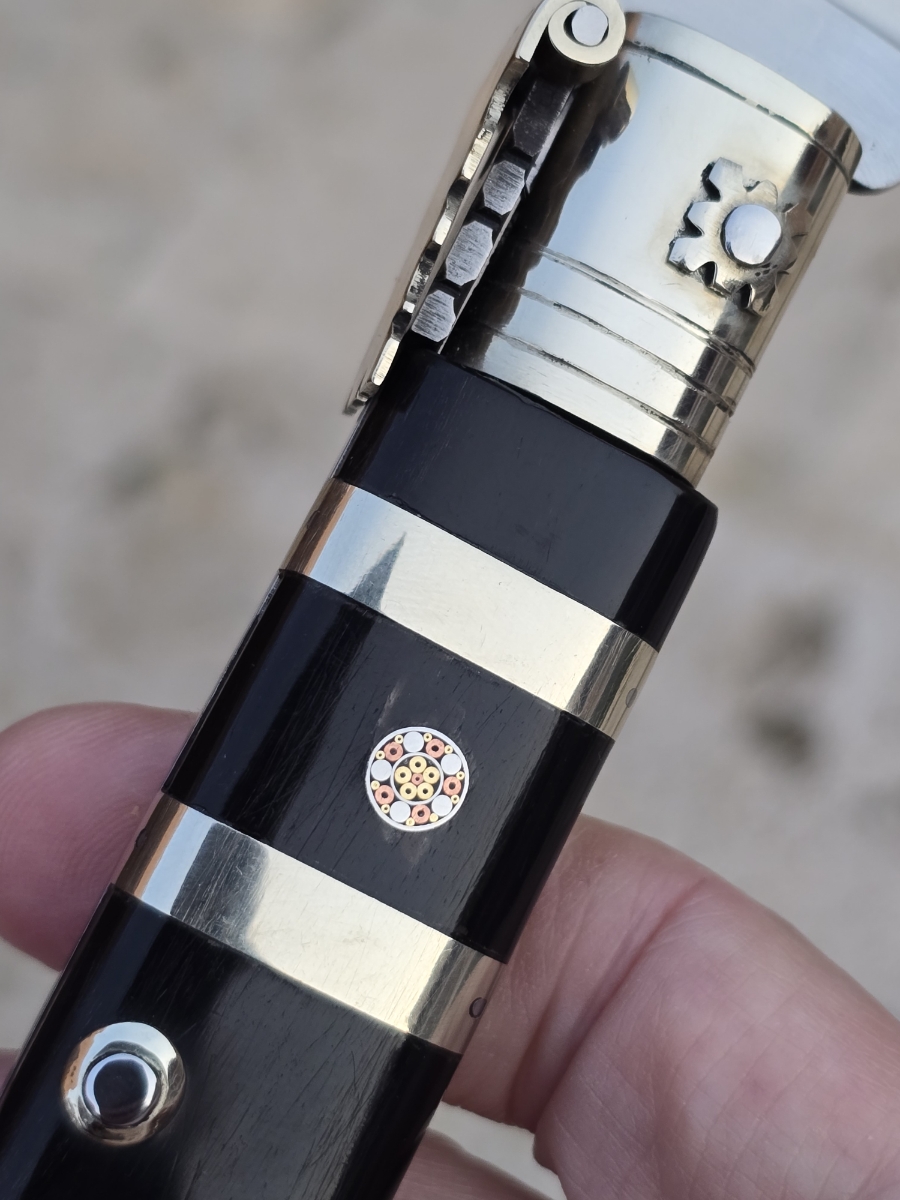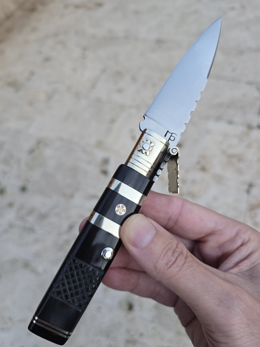 Pieza enteriza en Búfalo seleccionado con repicado, virola, arandelas, cintillos y palanquilla reliá en alpaca, pin mosaico y talón en piezas de alpaca, fibra vulcanizada y Búfalo, hoja de 95 mm en acero inox sandvick 14c28n con el lomo decorado, vaciado plano a cero y terminación satinada, PURA 🤜🤛ARTESANÍA!!!!!!!!!!!!!!! 💯🇪🇦